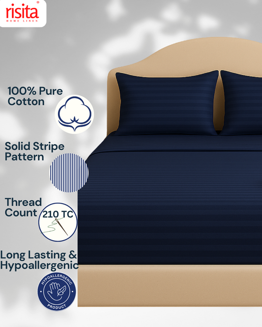 Pure Luxe - 100% Cotton 210 TC Satin Stripe King Size Bedsheet - Navy Blue