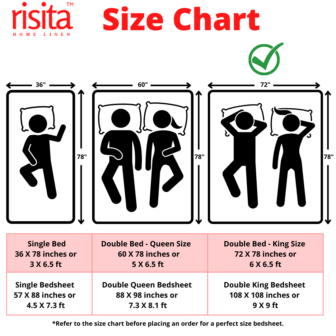 • Bedsheet Size: 108 Inch X 108 Inch or 274 Cm X 274 Cm or 9 feet X 9 feet.